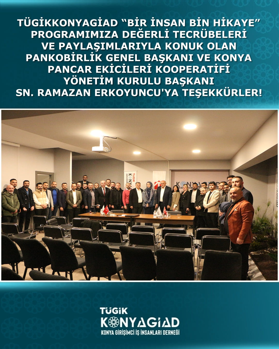 TÜGİKKONYAGİAD’ın “Bir İnsan Bin Hikaye” programının bu ayki konuğu, PANKOBİRLİK Genel Başkanı ve Konya Pancar Ekicileri Kooperatifi Yönetim Kurulu Başkanı Ramazan Erkoyuncu oldu.