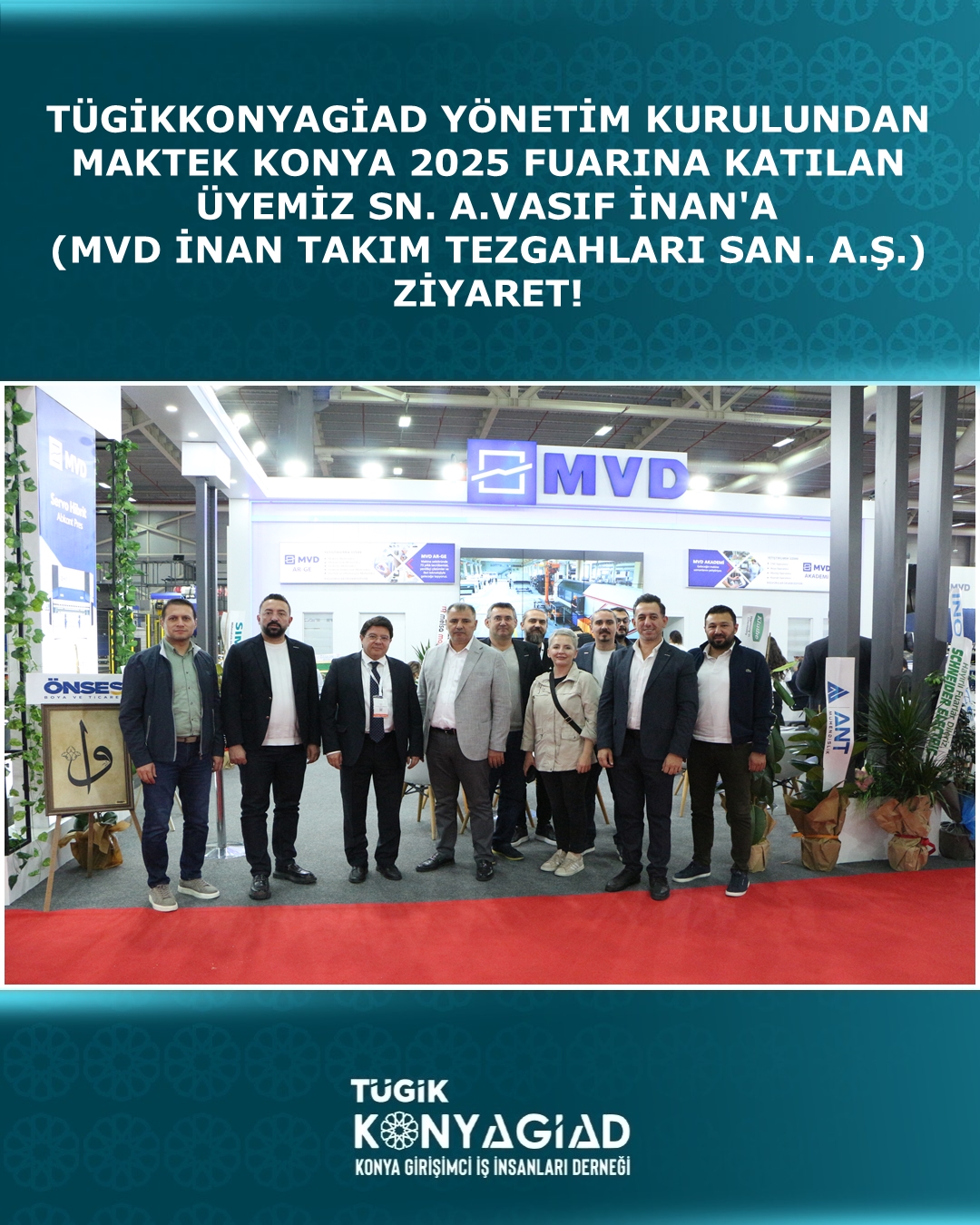 Tügik Konya Girişimci İş İnsanları Derneği Yönetim Kurulu Başkanı Sn. Gülvezir Korkmaz ve Yönetim Kurulu Üyelerimiz, MAKTEK Konya 2025 fuarına katılım sağlayan üyemiz Sn. A. Vasıf İnan’ı (Mvd İnan Takım Tezgahları San. A.Ş.) fuar standında ziyaret etti.