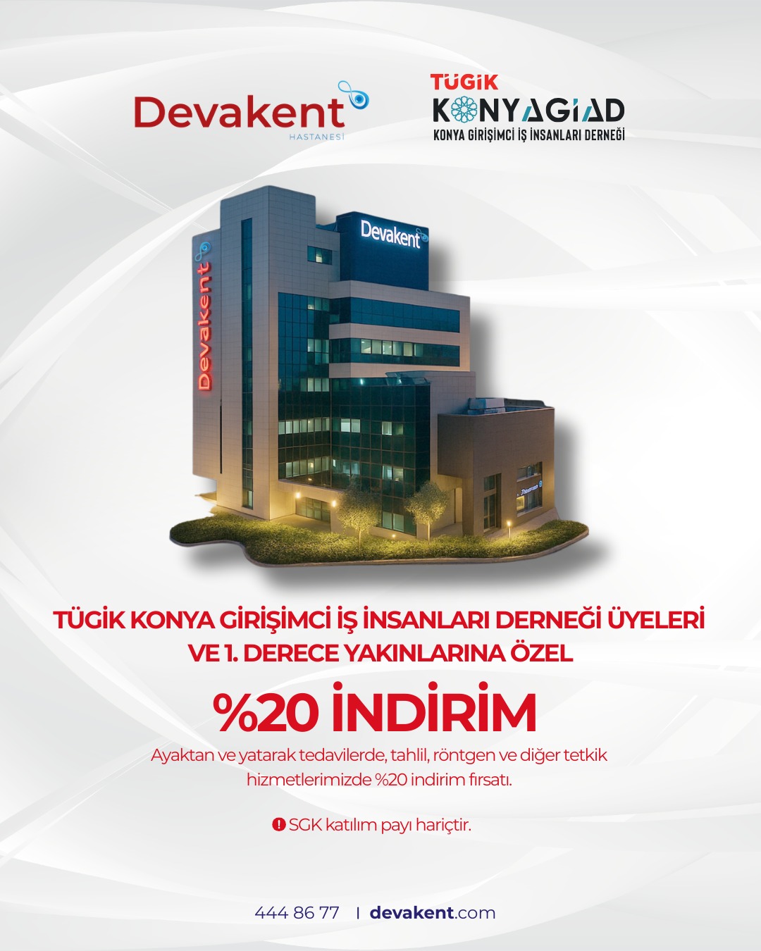 TÜGİK Konya Girişimci İş İnsanları Derneği olarak, üyelerimizin ve ailelerinin sağlık hizmetlerine daha kolay erişebilmesi adına Özel Devakent Hastanesi ile bir iş birliği protokolü imzalamış bulunmaktayız.