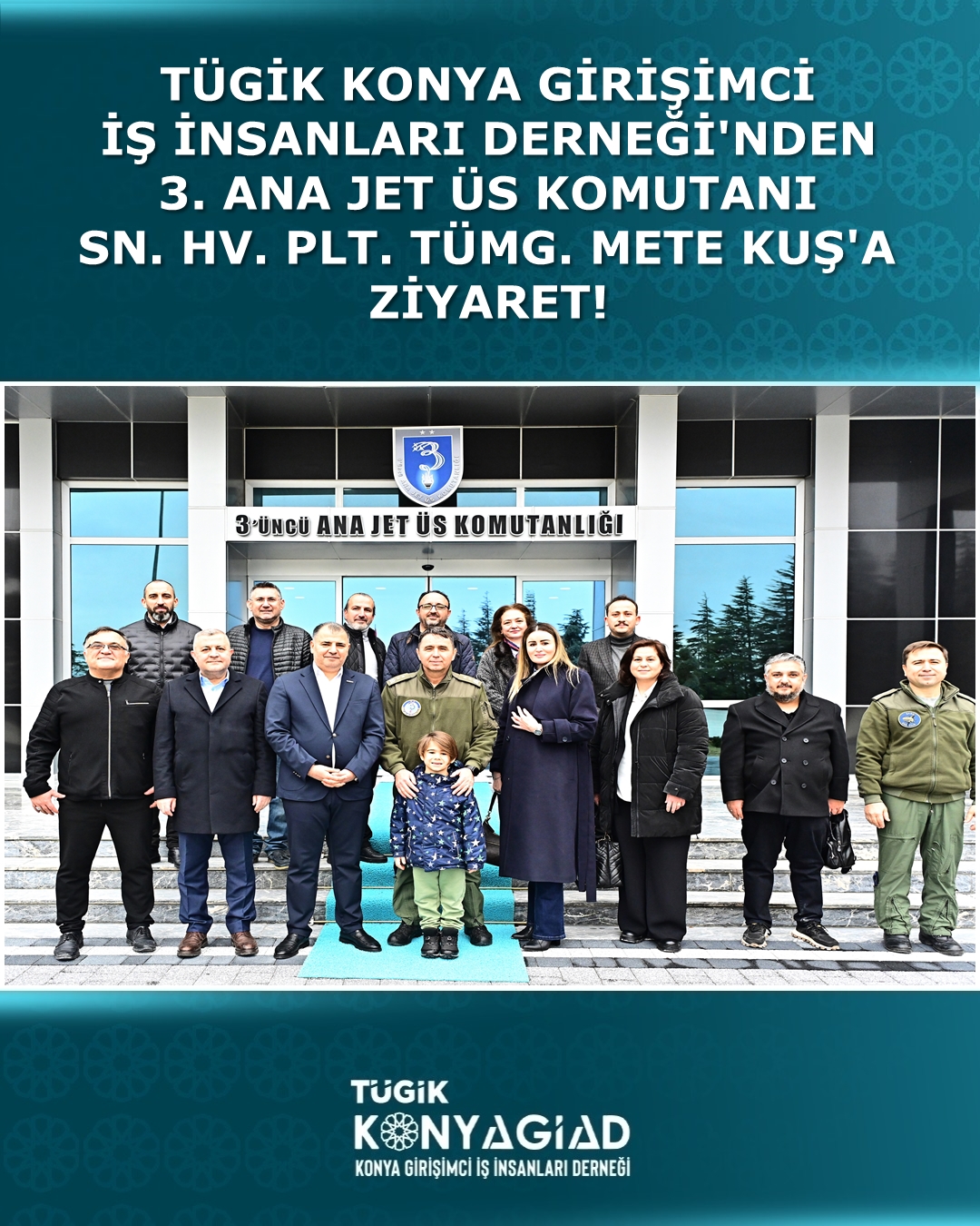 TÜGİK Konya Girişimci İş İnsanları Derneği (TÜGİKKONYAGİAD), şehrimizin ve ülkemizin savunma sanayi ile askeri strateji açısından en kritik noktalarından biri olan ve Konya'nın gurur kaynağı olan 3. Ana Jet Üs Komutanlığı’na nezaket ziyaretinde bulundu.