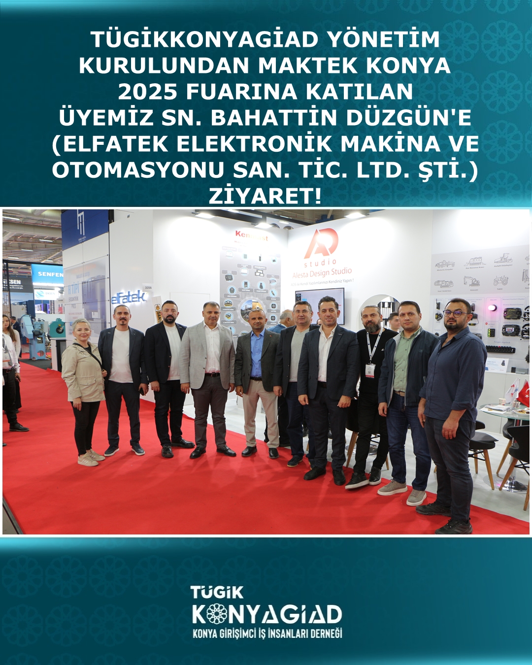 Tügik Konya Girişimci İş İnsanları Derneği Yönetim Kurulu Başkanı Sn. Gülvezir Korkmaz ve Yönetim Kurulu Üyelerimiz, MAKTEK Konya 2025 fuarına katılım sağlayan üyemiz Sn. Bahattin Düzgün’ü (Elfatek Elektronik Makina Ve Otomasyonu San. Tic. Ltd. Şti.) Fuar Standında Ziyaret Etti.